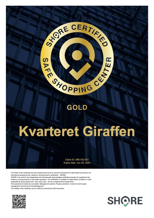 - The SHORE certification shows that Kvarteret Giraffen has a good international standard in its safety and security work. They add value through good preventive work that minimises the risks for tenants and visitors to Kvarteret Giraffen. It also shows that they are very well prepared to handle any incidents," says Erik Engstrand, CEO of Safe Asset Group.