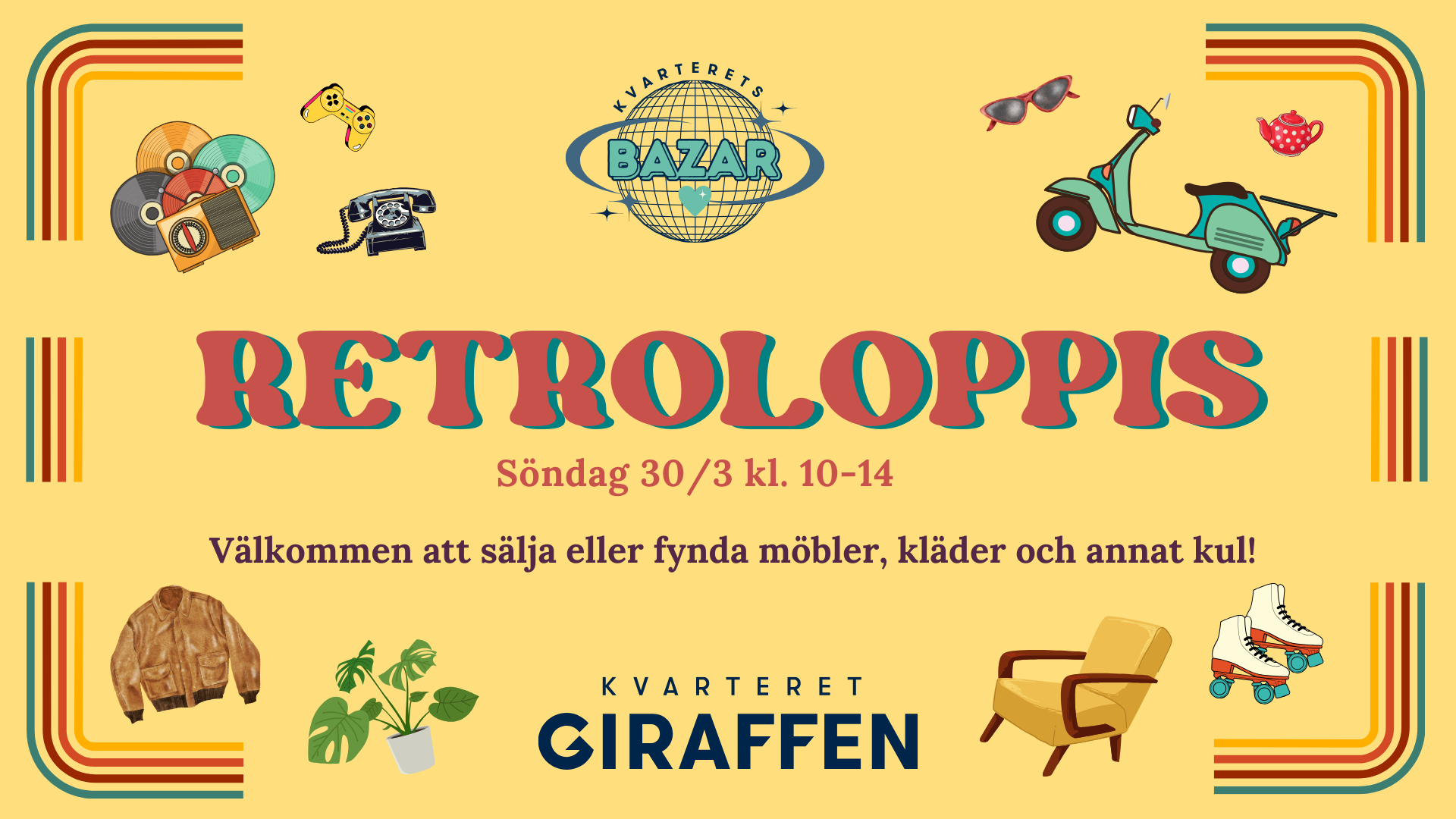 Varmt välkommen till en dag fylld av nostalgi, unika fynd och härlig stämning! Den 30 mars kl. 10.00-14.00 förvandlas Kvarteret Giraffens Bazar (lokalen bredvid ÖoB) till en livfull marknadsplats där retroälskare samlas för att köpa och sälja kläder, inredning och andra tidsenliga skatter.